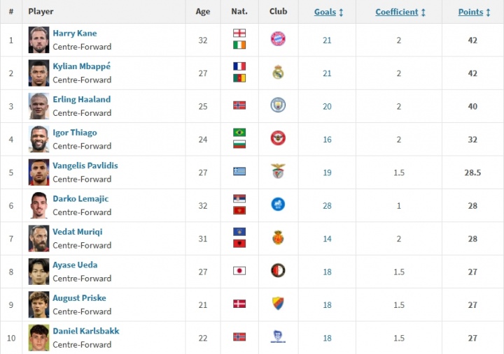 最新欧洲金靴排名: